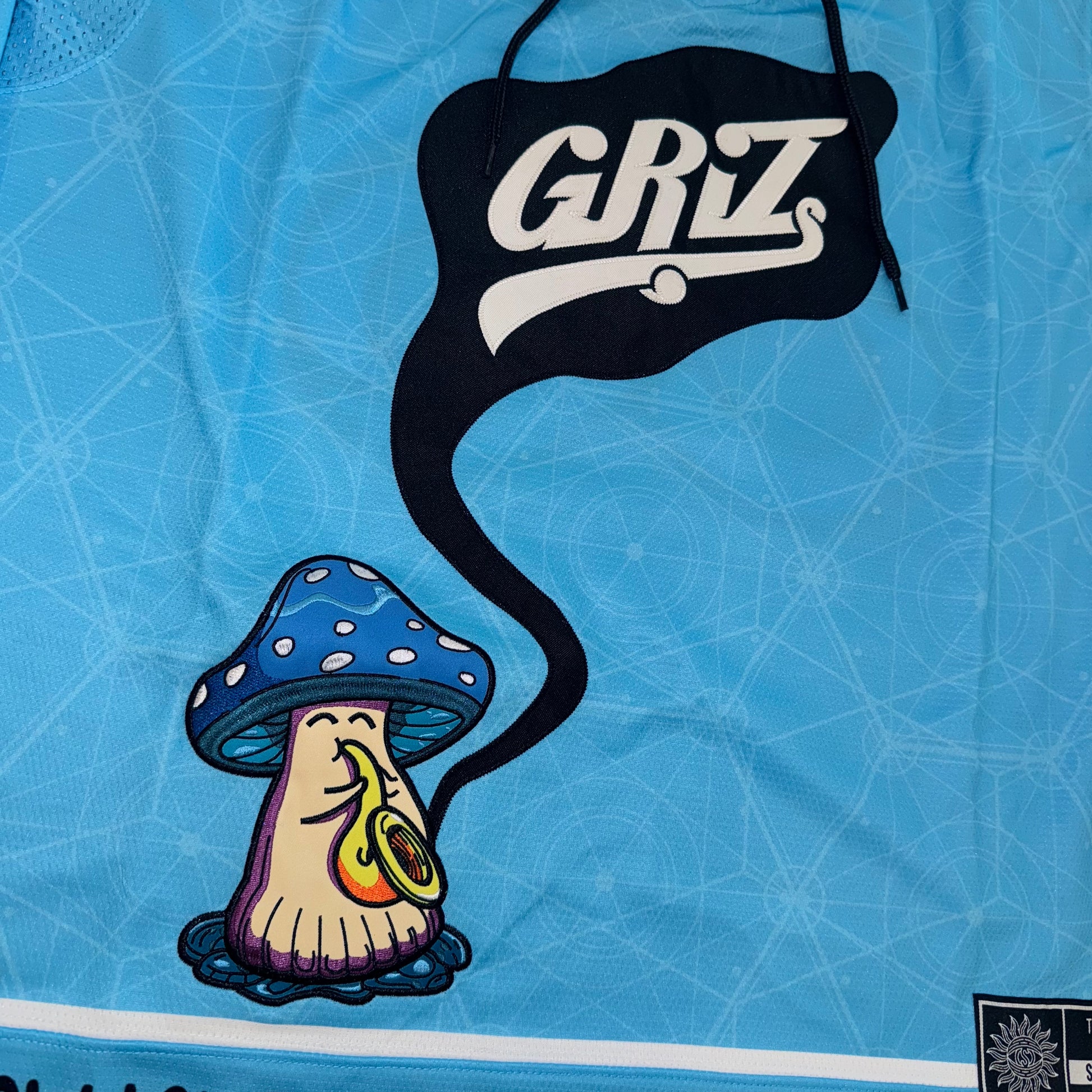 Introducing the V2 Mushroom Hockey Jersey, the latest evolution in Sunshine's Officially Licensed GRiZ Merchandise. This jersey showcases a whimsical mushroom playing the saxophone, its musical notes seamlessly transforming into the signature GRiZ logo. On the back, it pays homage to the beloved "INFINITE" record, with infinity symbols on the back and arms – a powerful testament that even after a brief hiatus, GRiZ is truly infinite.